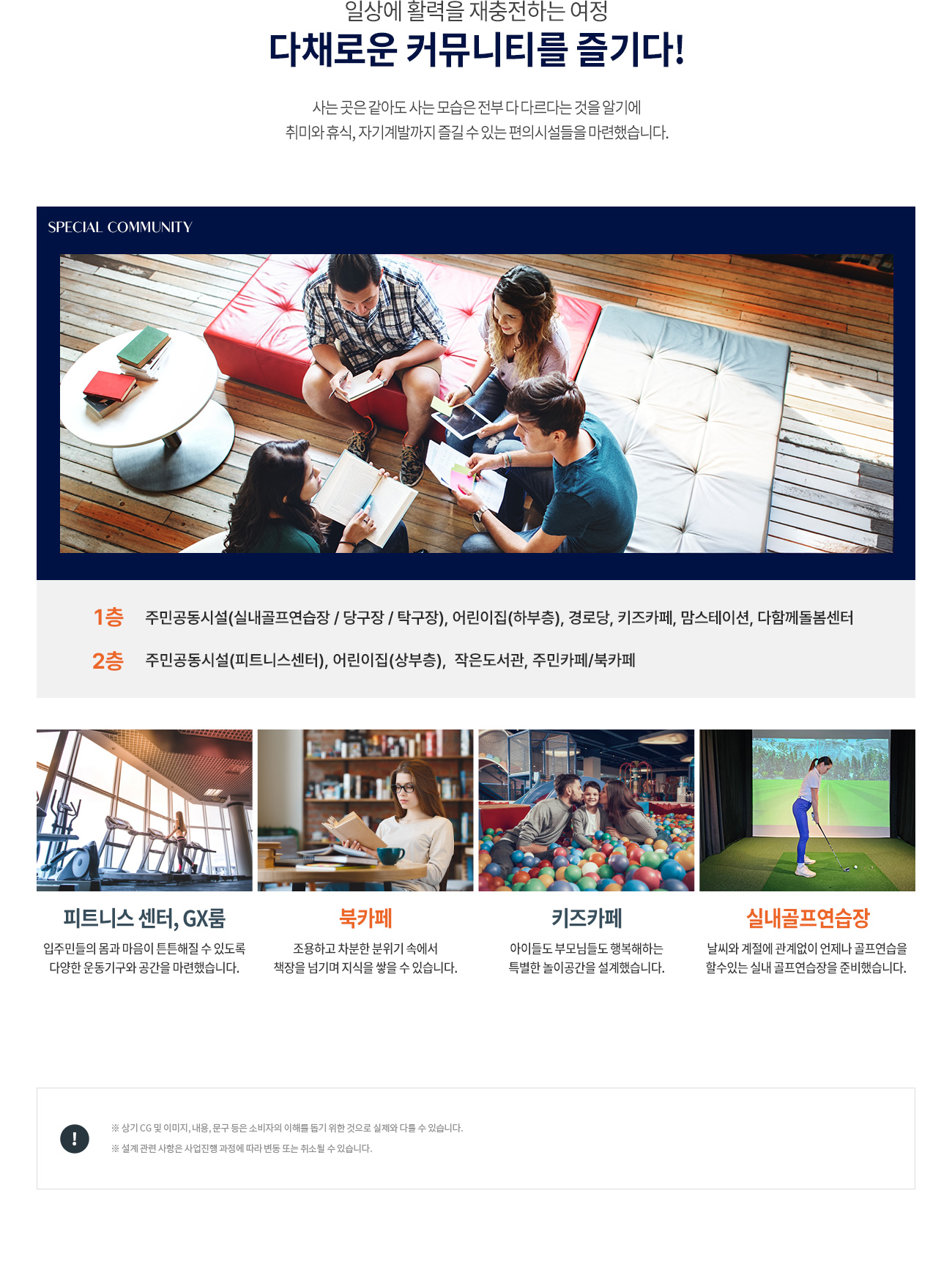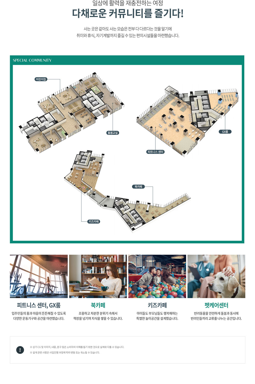 - 키즈카페, 북 카페, 시니어 존, 펫 케어 센터, 피트니스센터 등 커뮤니티 시설이 갖춰져 있습니다.