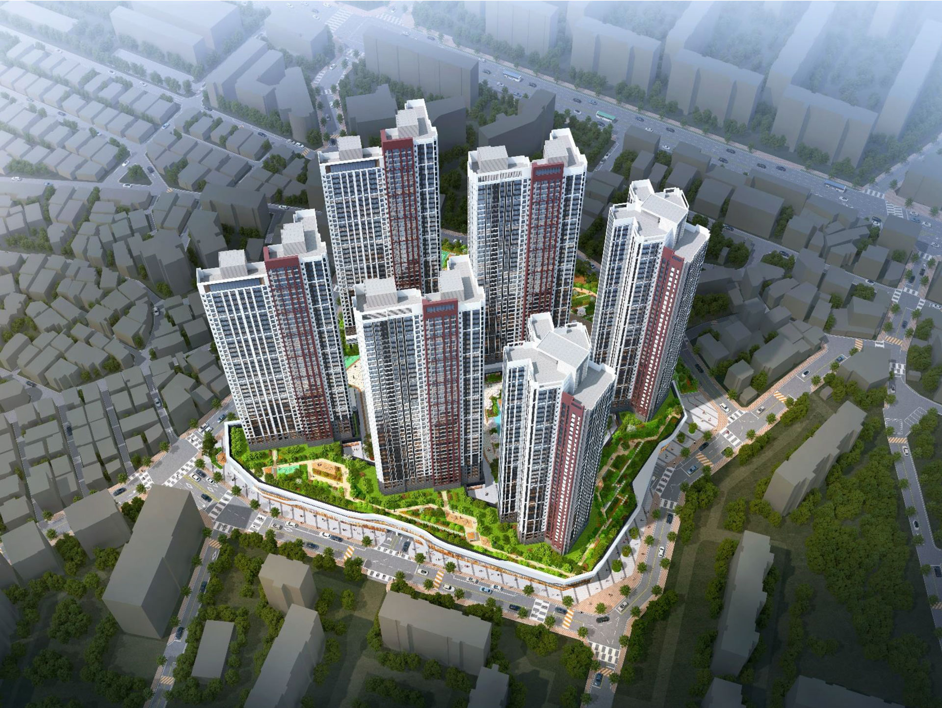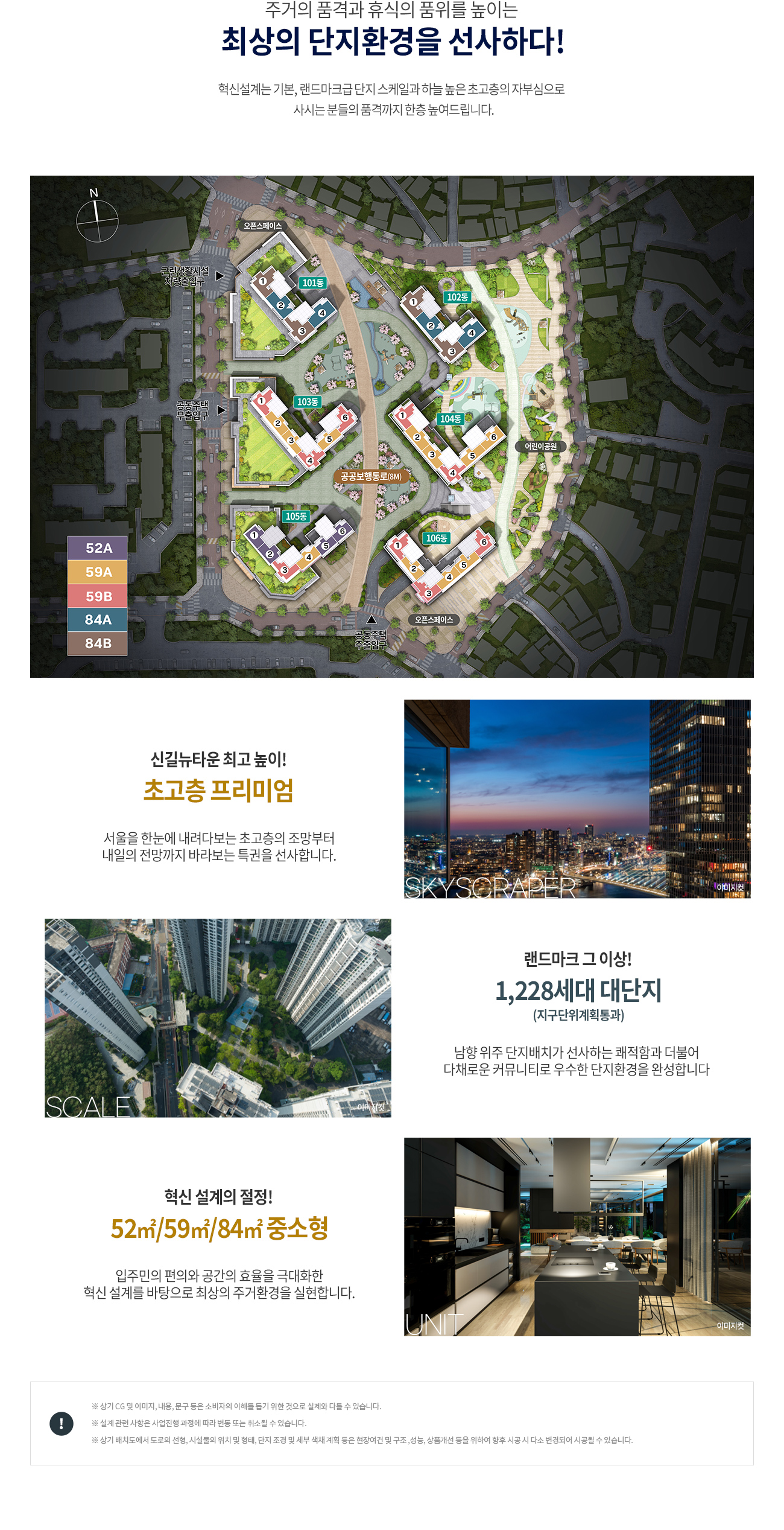 지하 4층부터 지상 42층까지 총 6개동으로 구성되어 있습니다.